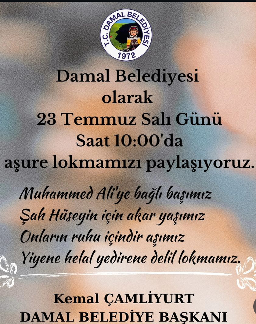 Damal Kaymakamlığı ve Damal Belediyesi olarak 23 Temmuz Salı günü saat 10:00 da Belediye Hizmet Binası önünde aşure ikramımız olacaktır.